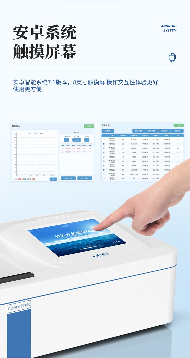 2.儀器采用安卓7.1版本智能操作系統,內置優云譜專用測油儀分析軟件,集譜圖、掃描、分析、計算于一體;